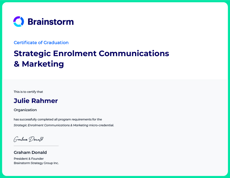 Active participants who complete the program requirements will receive their micro-credential in Strategic Enrolment Communications & Marketing, including a certificate and badge, and will be included in the list of qualified program graduates.